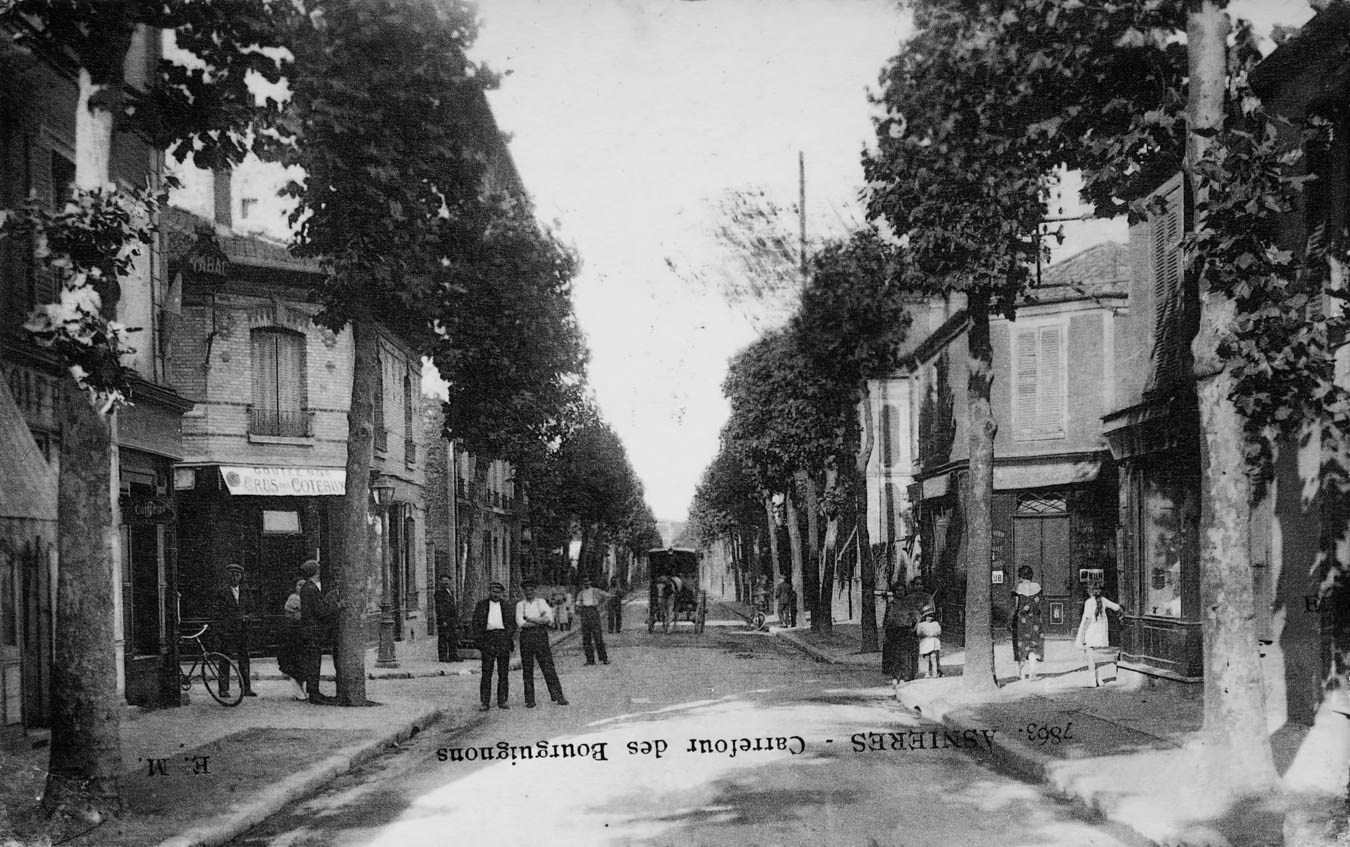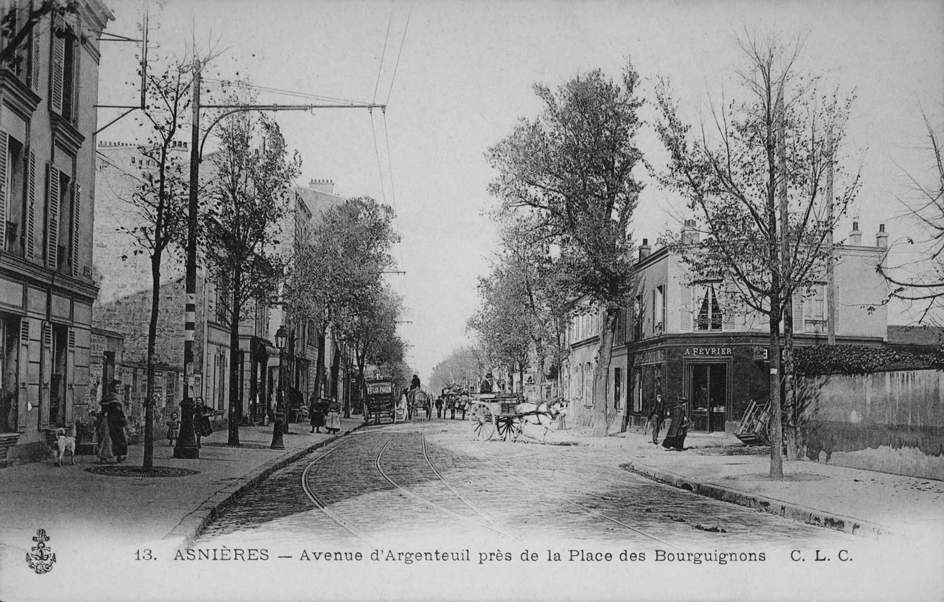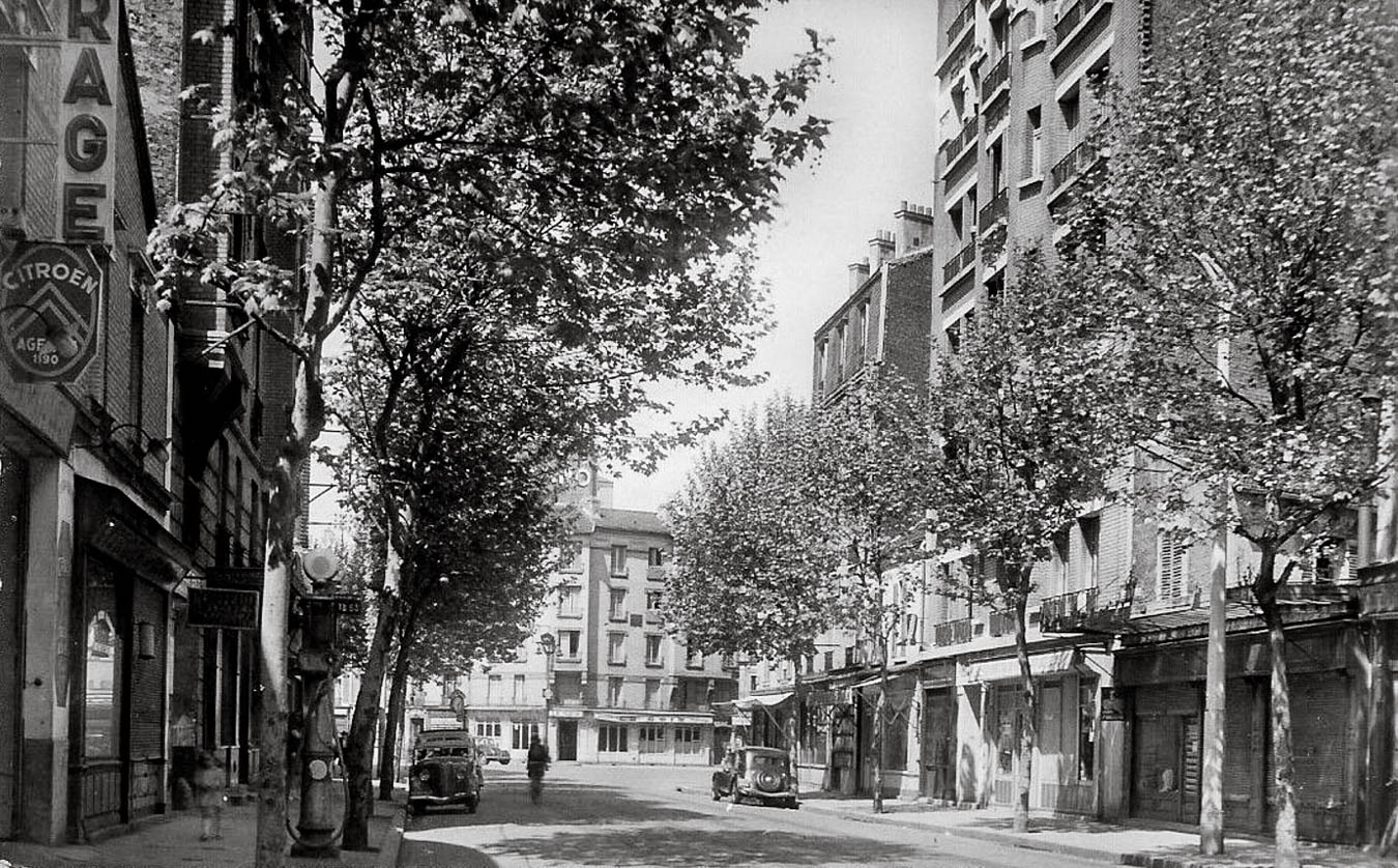 Nous voici un peu loin sur l’avenue d’Argenteuil à Asnières vers 1930. À gauche, on distingue clairement un garage Citroën, identifiable grâce à la plaque émaillée indiquant aussi 'AGENCE 1190'. Le carrefour des Bourguignons se devine au fond. Notez que la focale ultra grand-angle de Google Street View peut légèrement déformer les perspectives et donner l’impression que le carrefour est plus éloigné qu’il ne l’est en réalité.