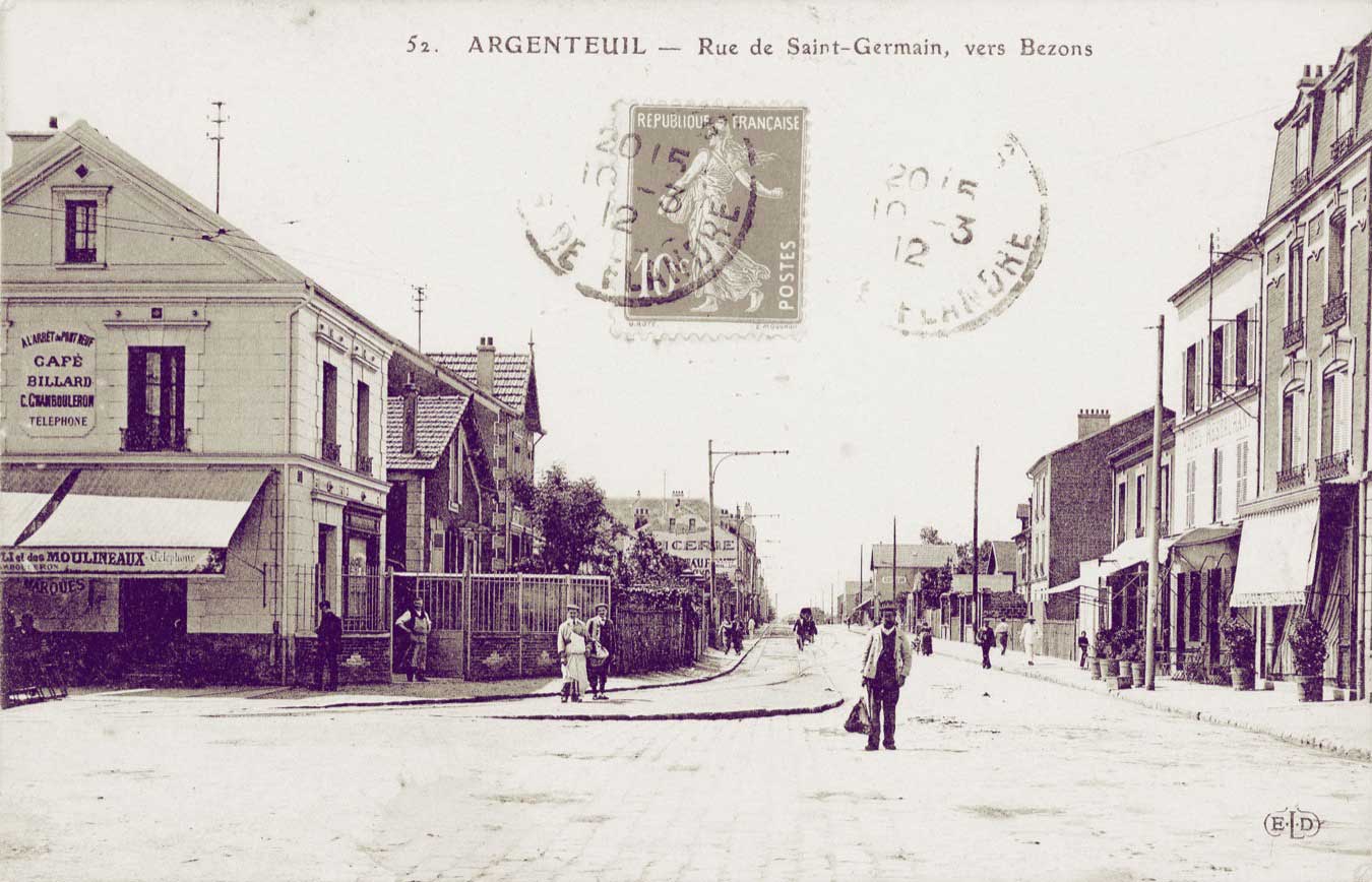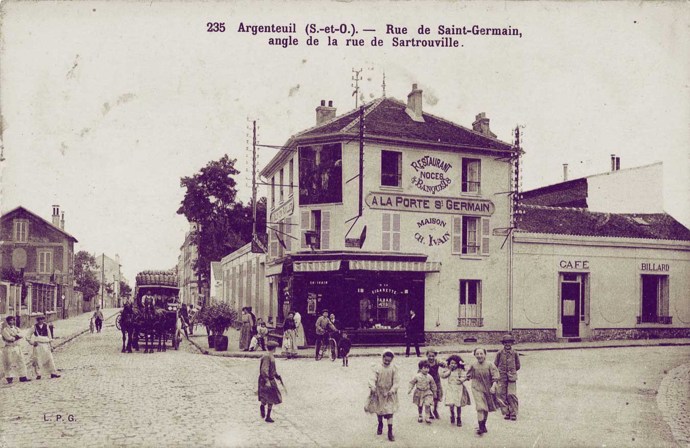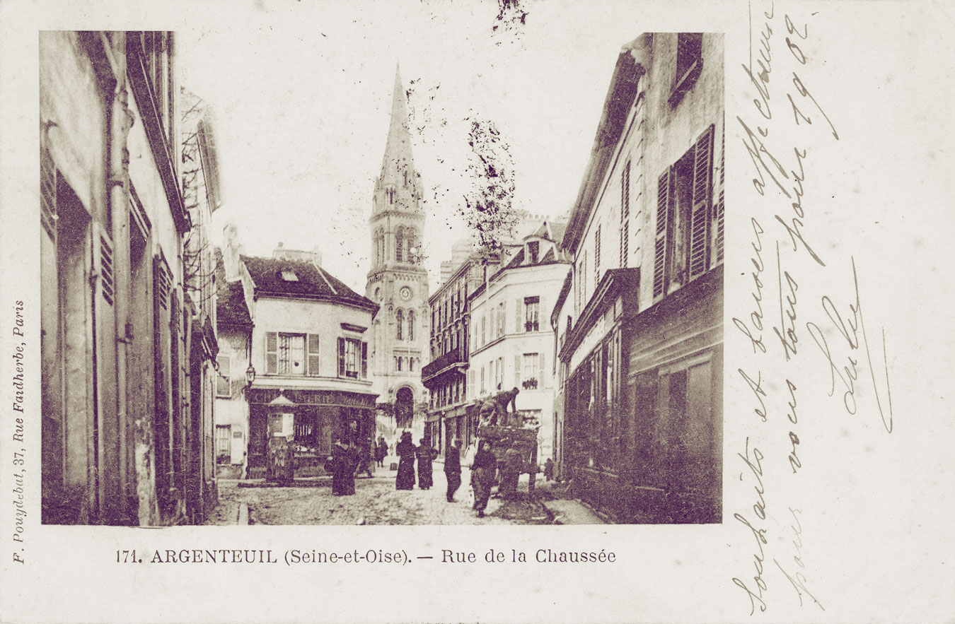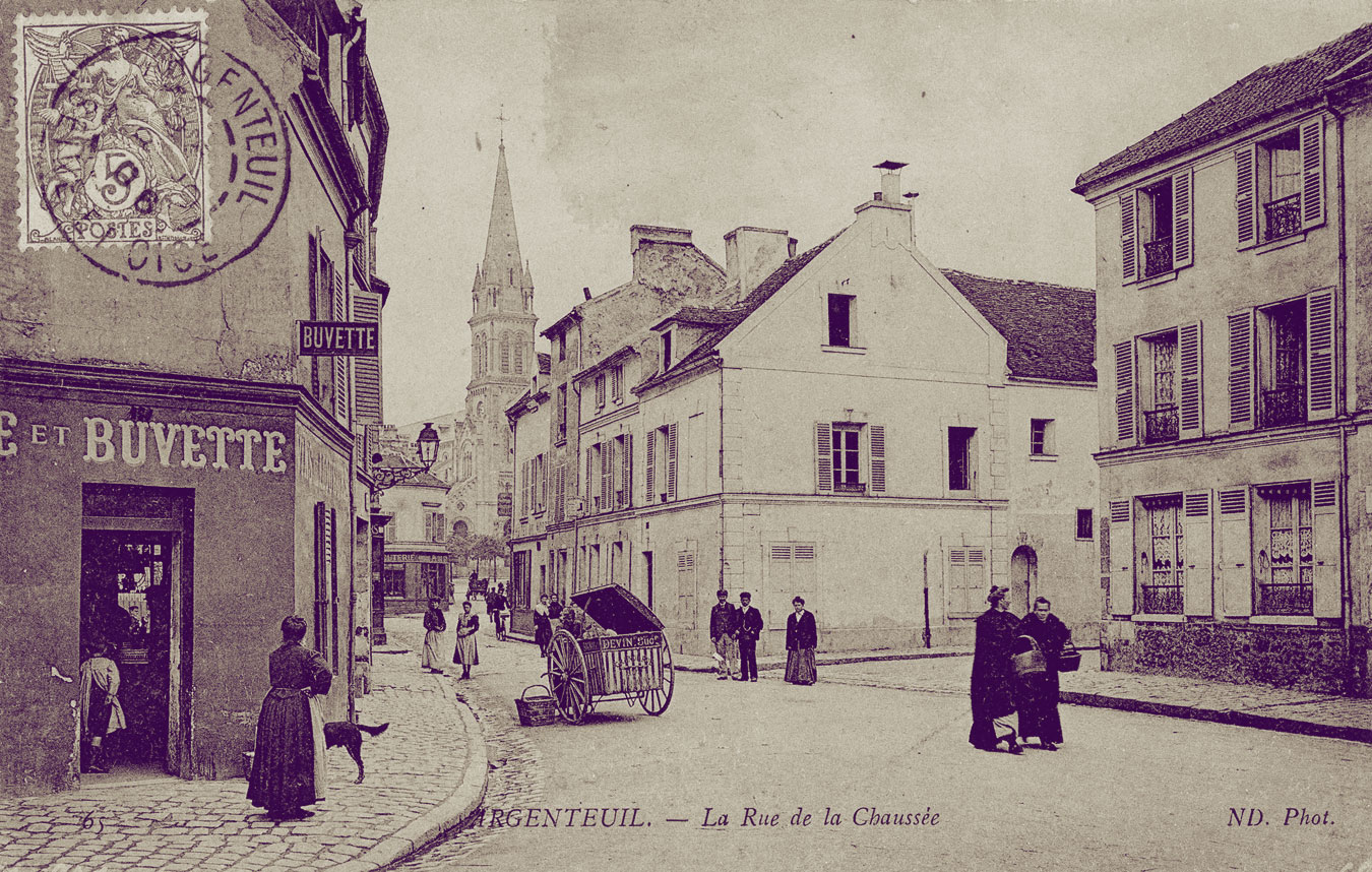 Claude Monet et Alfred Sisley ont peint cette rue, rue de la Chaussée, en 1872 (actuelle rue du 8 mai 1945). Le marché de la ville se tenait sur cette place avant d'être déménagé sur le boulevard Héloïse. Près de la buvette, s'amorce la rue des Saint-pères. A droite c'est la rue Notre-Dame où se trouvait l'abbaye.