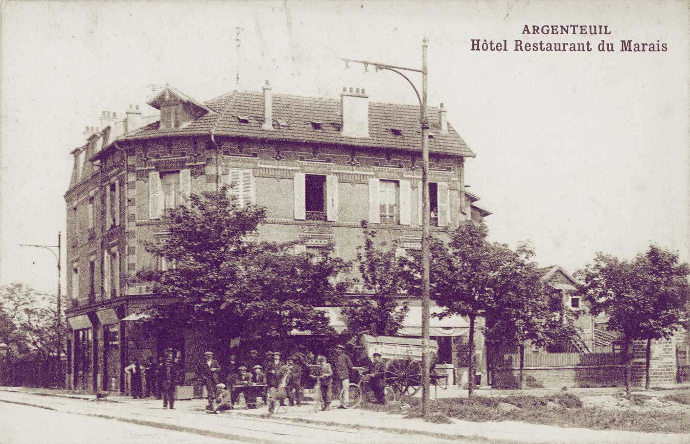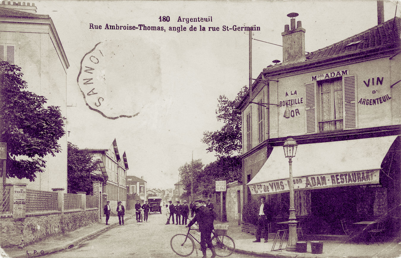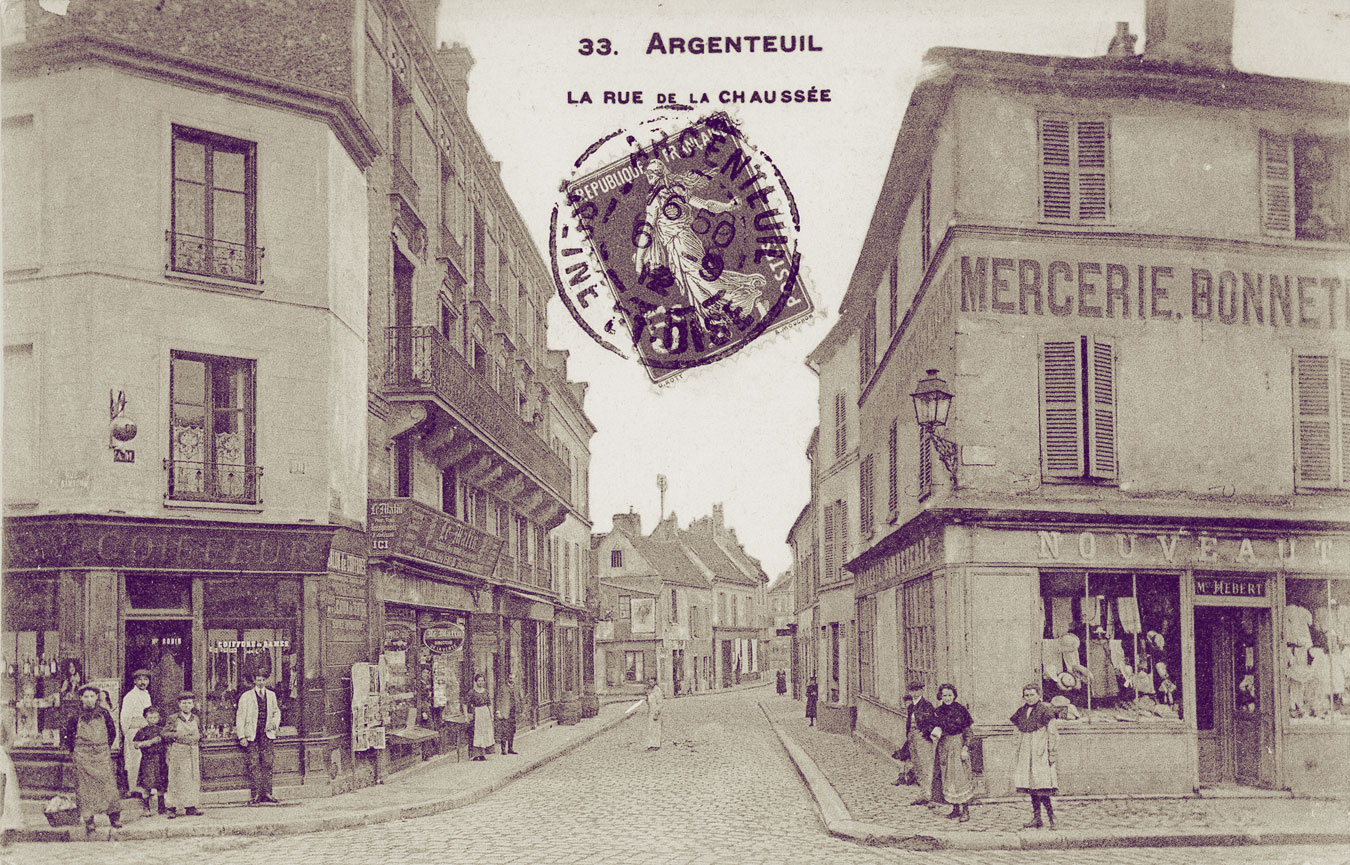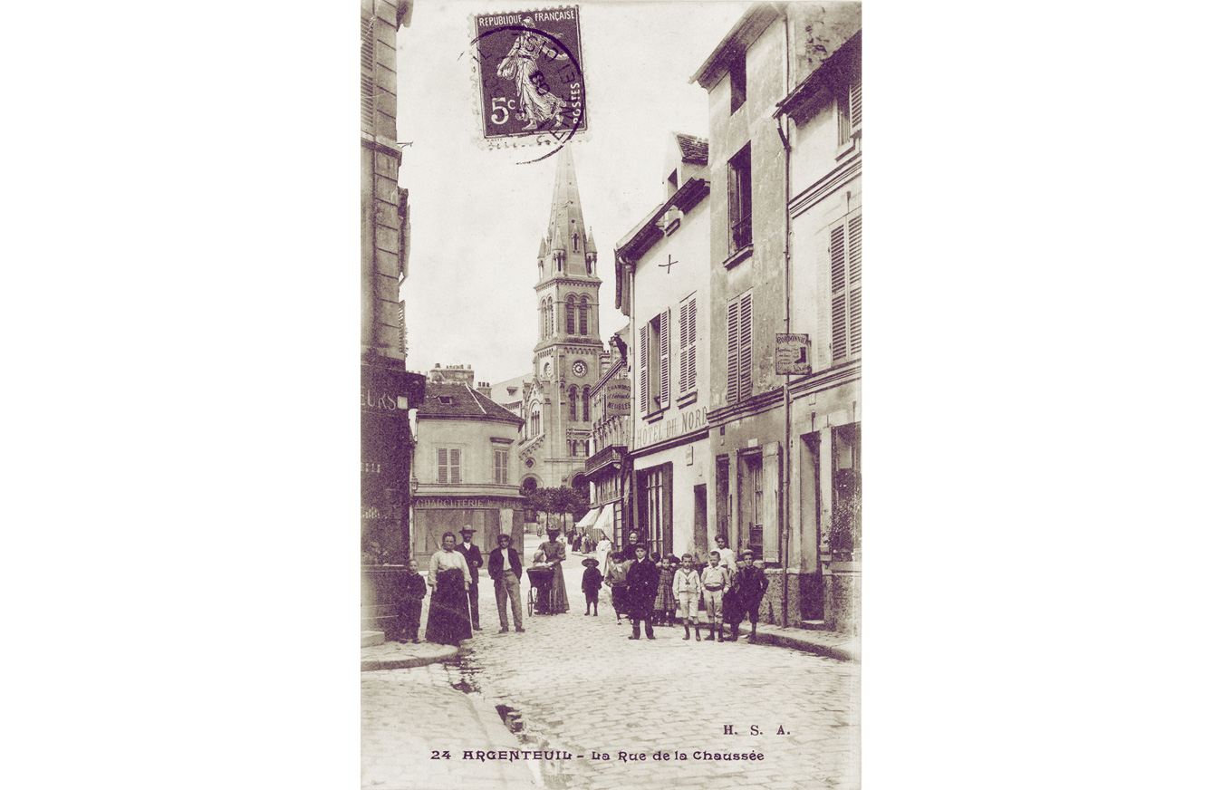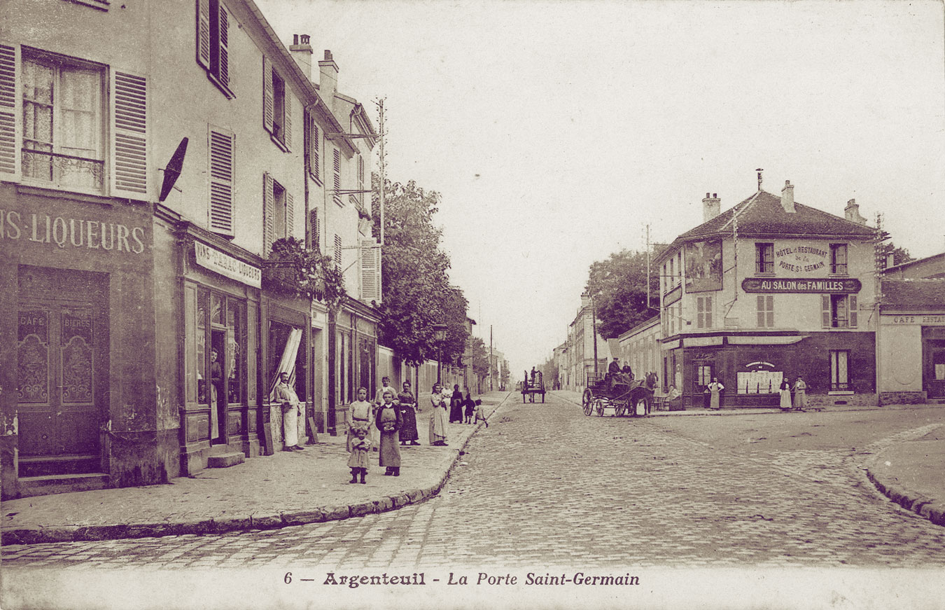 Claude Monet et Alfred Sisley ont peint cette rue, rue de la Chaussée, en 1872 (actuelle rue du 8 mai 1945). Le marché de la ville se tenait sur cette place avant d'être déménagé sur le boulevard Héloïse. Près de la buvette, s'amorce la rue des Saint-pères. A droite c'est la rue Notre-Dame où se trouvait l'abbaye.