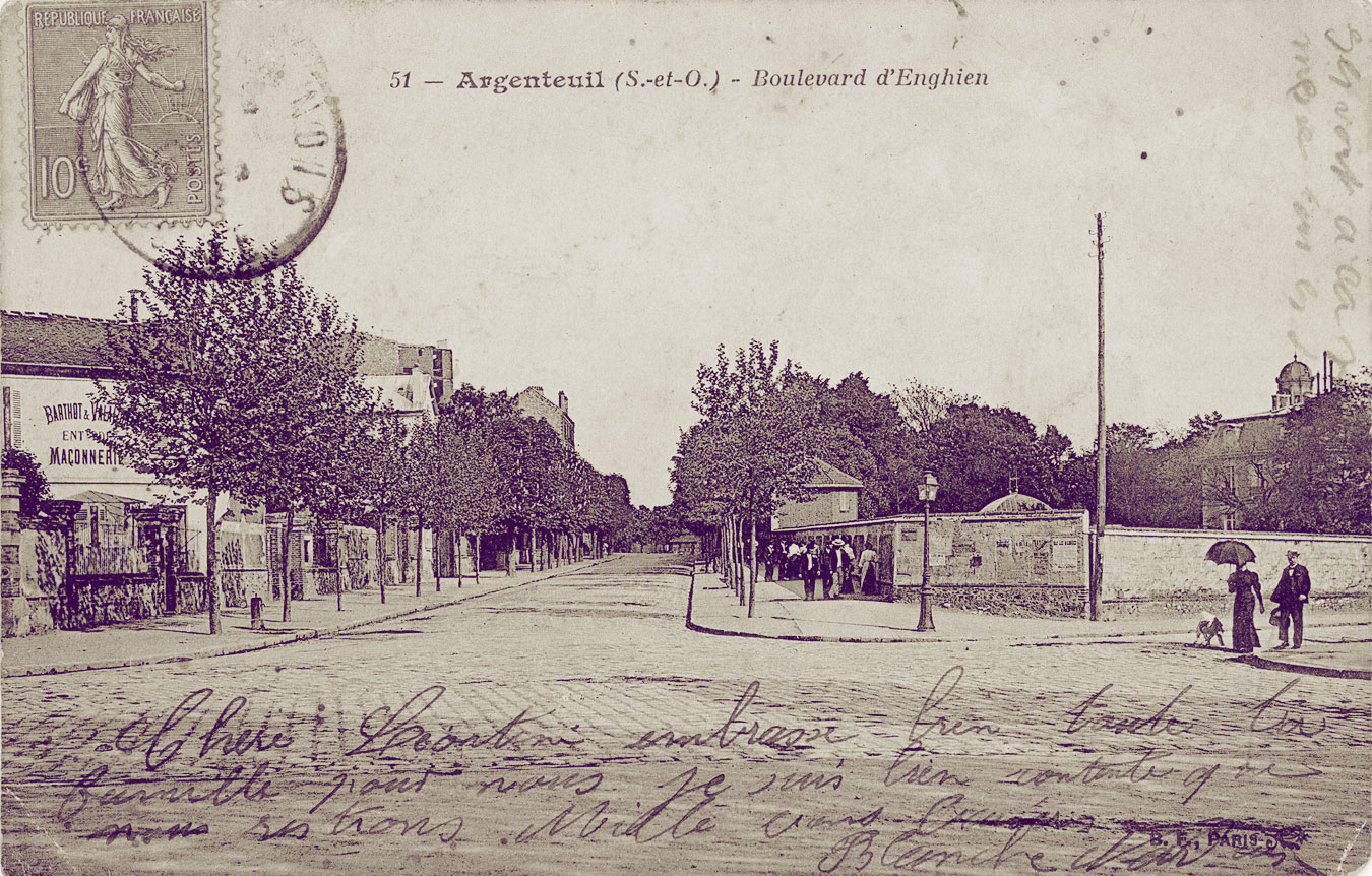 Le mur d'enceinte continuait boulevard d'Enghien (actuel bd Maurice Berteaux). A droite, se trouvait la propriété de Bayard-Joly avec le château de César Jolly, construit en 1875. Il existe toujours, bien que moins visible de la rue.