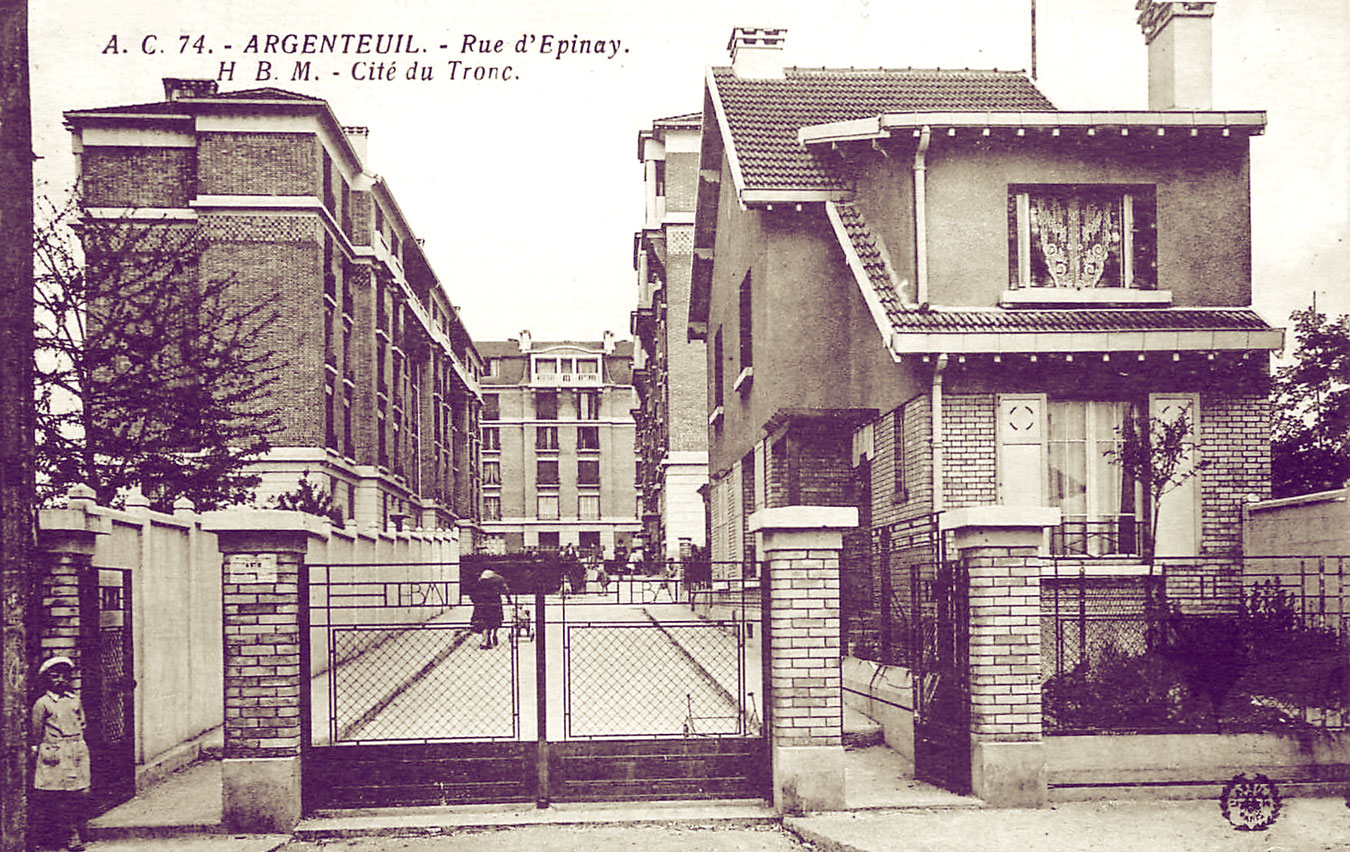 La cité HBM a été crée en 1933 dans un style Art déco. Sa décoration en mosaïque bleue lui donne encore aujourd'hui une belle allure. La photo a été prise de rue d'Epinay mais on voit mieux le bâtiment en streetview depuis la rue Emile Savoy