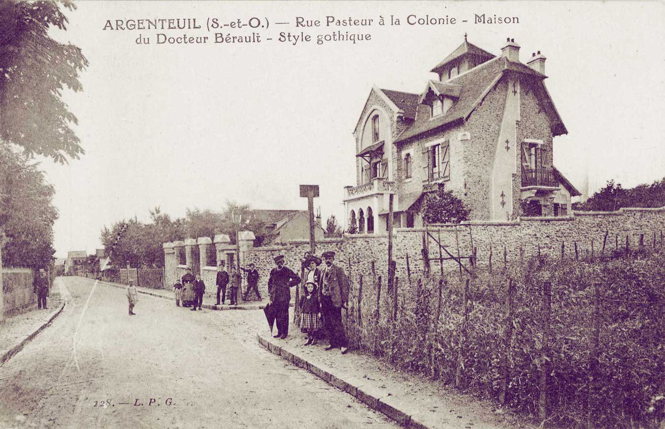 La végétation a bien poussé autour de la maison de style gothique. La pierre gravée "Accidents du Travail" placée au coin de la rue, n'avait pas encore été posé lorsque la photo a été prise. Au dos de la carte, se trouve une publicité imprimée : "Les accidentés du Travail sont reçus à notre cabinet, 15, rue Pasteur tous les matins de 8h à 9h (sauf le samedi) et tous les après-midi de 1 à 3h (sauf le dimanche)". Aujourd'hui la maison n'est pas au 15 mais au 21.