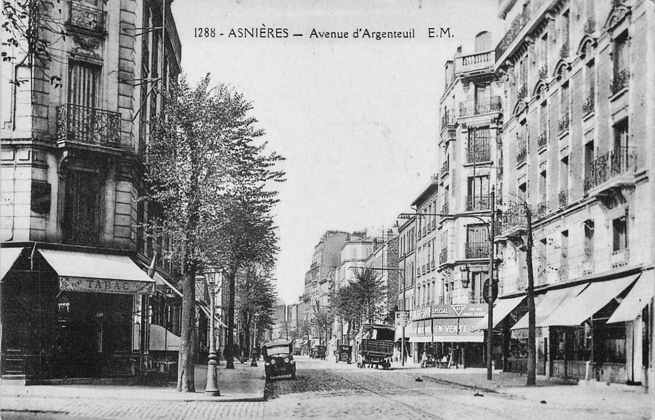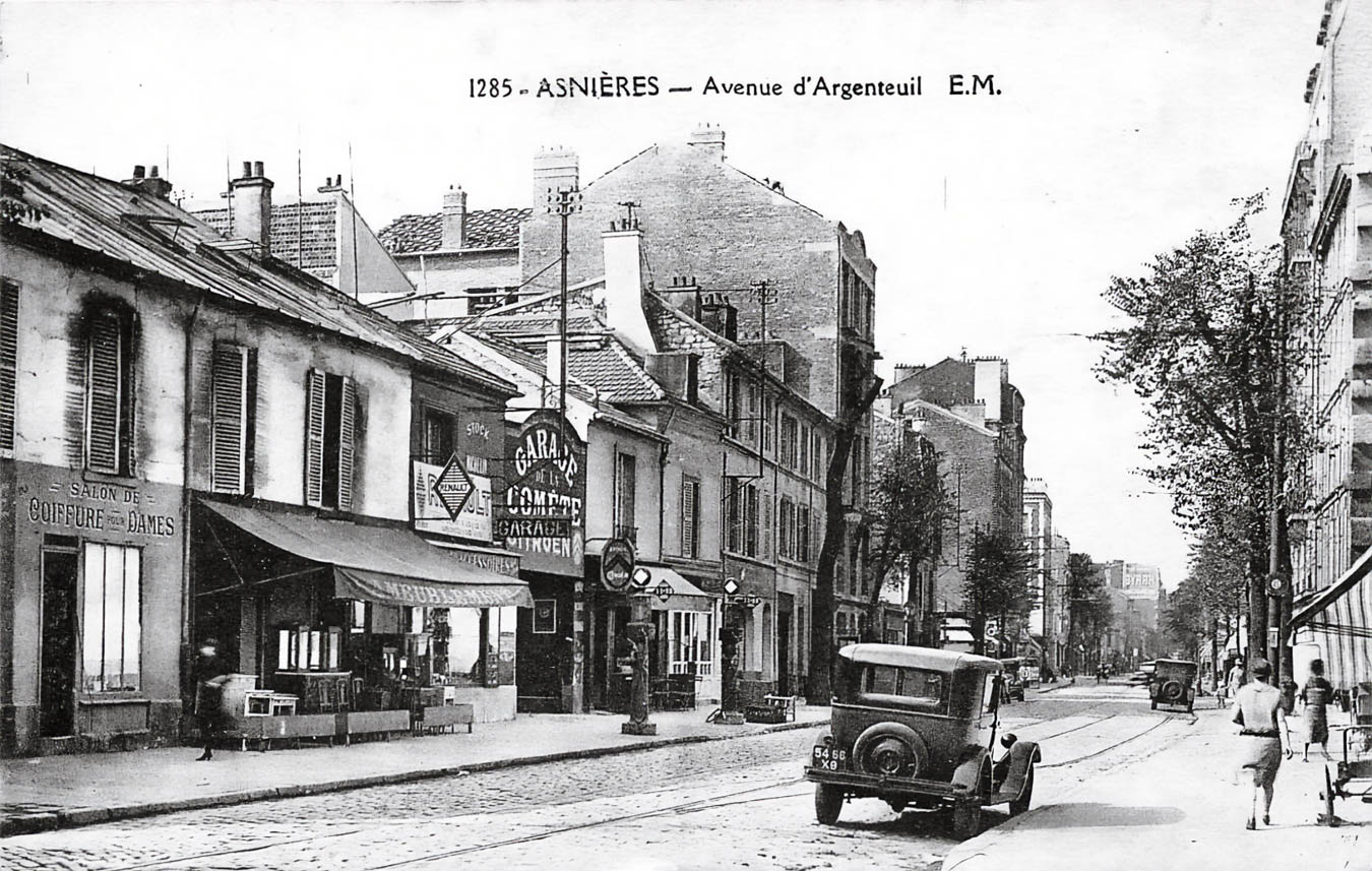 Nous voici un peu loin sur l’avenue d’Argenteuil à Asnières vers 1930. À gauche, on distingue clairement un garage Citroën, identifiable grâce à la plaque émaillée indiquant aussi 'AGENCE 1190'. Le carrefour des Bourguignons se devine au fond. Notez que la focale ultra grand-angle de Google Street View peut légèrement déformer les perspectives et donner l’impression que le carrefour est plus éloigné qu’il ne l’est en réalité.